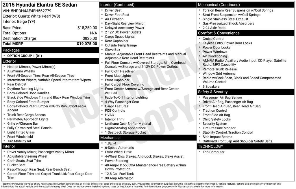 2015 Hyundai Elantra SE Quartz White Pearl FWD 6-Speed Automatic with Shiftronic 1.8L I4 MPI DOHC 16V ULEV II 145hp