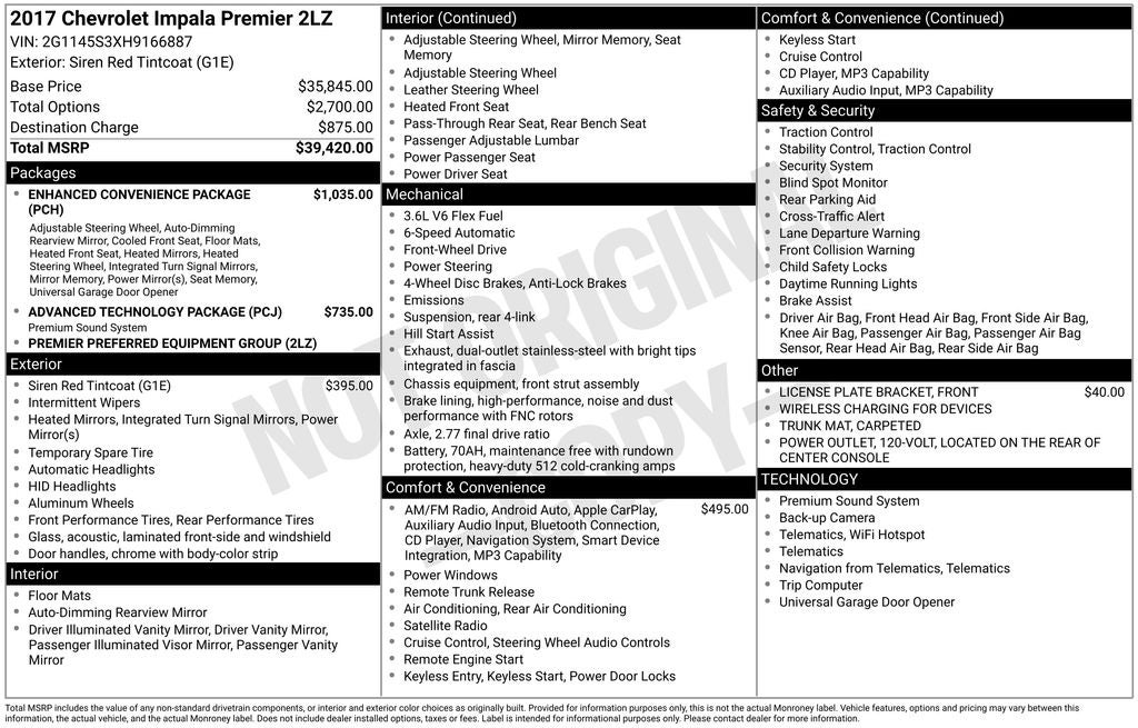 Certified. 2017 Chevrolet Impala Premier 2LZ Siren Red Tintcoat FWD 6-Speed Automatic Electronic with Overdrive 3.6L V6 DI DOHC