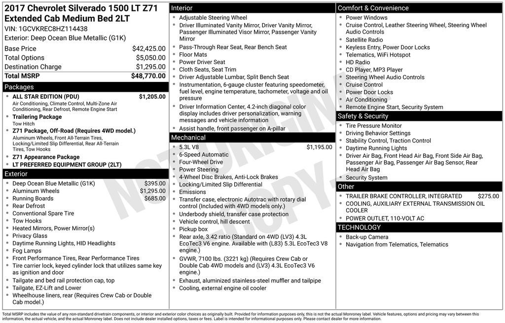 - Z71 Package, Off-Road (Requires 4WD model.), includes monotube Rancho brand shocks, (K47) air cleaner, (JHD) Hill Descent Control, (NZZ) underbody shield and (V76) recovery hooks. Also includes brushed metal Z71 door sill plate, unique Z71 gauge cluster, unique finish interior trim plates, unique lower bumper appearance, unique grille design with Z71 badge and Z71 pickup box decals (Includes (Z82) Trailering Package, (G80) locking rear differential and (RD1) 18" bright machined wheels and (RBX) 18" tires. Upgradeable to (RD4) 20" polished-aluminum wheels or 22" LPO wheels.)